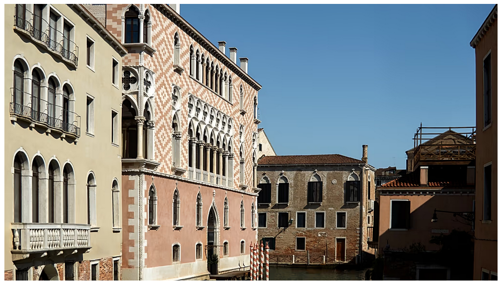 O histórico edifício, situado perto da Praça de São Marcos, é conhecido pela arquitetura gótica e pelas vistas sobre a lagoa.